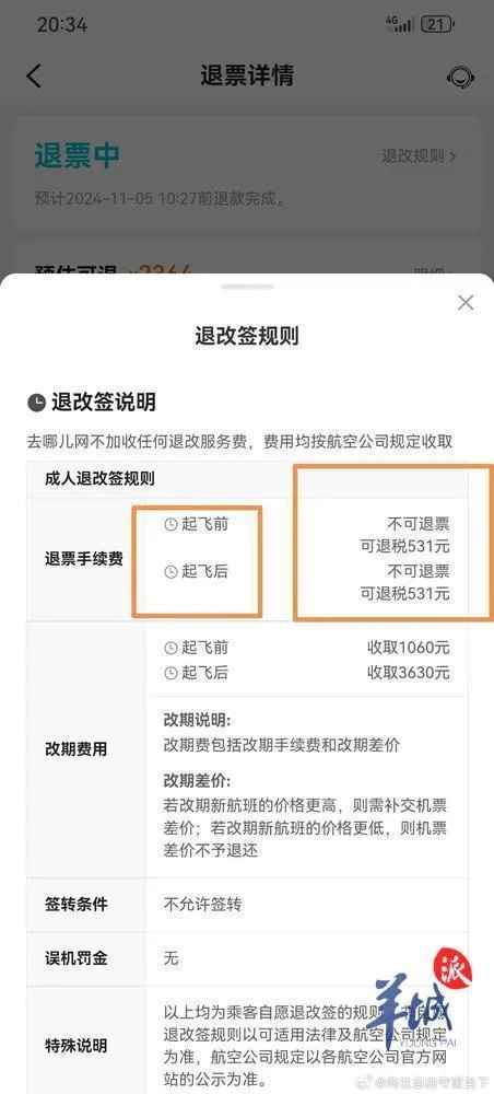 在此之前,2023年10月,广州律师廖建勋在发现买错机票之后,几分钟提交退订并重新订购,却被扣了近90%的费用。两张票的订票费合计1572元,“两张机票被收取了1038元的退票手续费,占票面价的89.9%”。