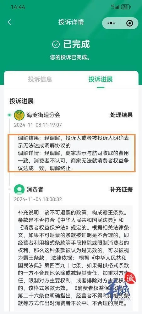 事发后,周先生于11月2日和3日共两次通过中国消费者协会官方微信中的“全国消协智慧315”板块投诉北京趣拿信息技术有限公司,一次“和解失败”,一次“终止调解”。“海淀街道分会”11月8日给出的处理结果显示:“经调解,商家表示与航司收取的费用一致,消费者不认可,商家无法就消费者权益争议达成一致,调解终止”。
