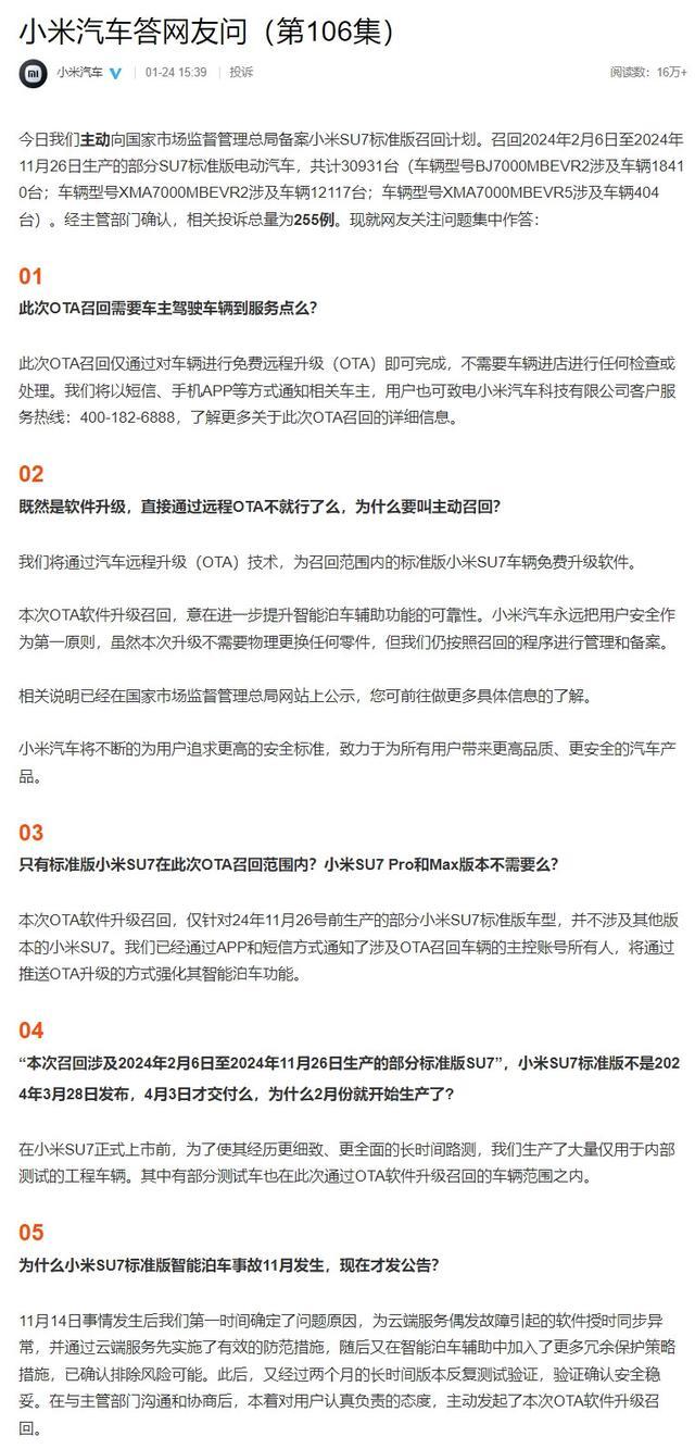 此次OTA召回仅通过对车辆远程升级(OTA)即可完成,不需要车辆进店进行任何检查或处理。小米将以短信、手机App等方式通知相关车主;